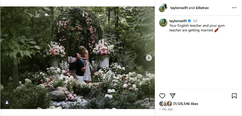 Forget jumbotrons at ball games and private hot air balloons, Travis made it mean something when he proposed in the backyard of his Kansas home, which he transformed into a floral oasis. Their Instagram caption, “Your English teacher and your gym teacher are getting married,” was cheeky, intimate, and totally Swift.